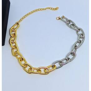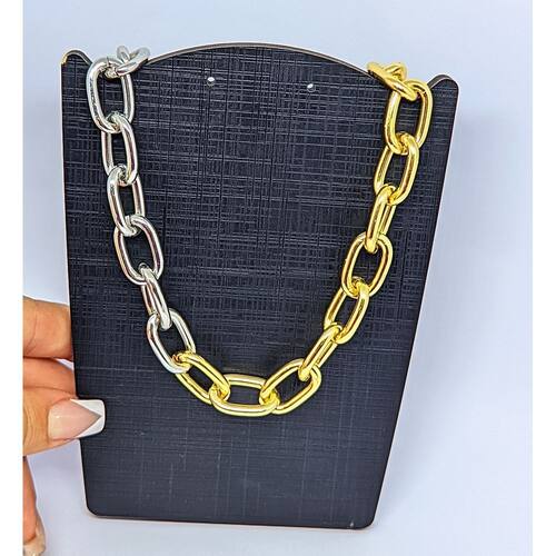 DADOS TÉCNICOSMedidas do Choker:Elos da Corrente : quadrado Duplo Dourado com Prata Material ; Metal Folheado com verniz cataforético Genero: feminino Comprimento: 40CmCom Extensor: 5CmDiâmetro: 3,5mmFecho: boia