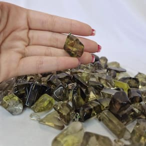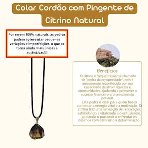 Colar Cordão com Pingente Citrino Natural Colar Cordão com Pingente de Citrino Natural Este colar com cordão e pingente de citrino natural é uma peça encantadora que combina a beleza do citrino com suas poderosas propriedades energéticas. O citrino é uma pedra conhecida por sua capacidade de atrair prosperidade, vitalidade e alegria. Ao ser como pingente, ele não só embeleza o visual, mas também serve como um amuleto que estimula a criatividade, promove o otimismo e fortalece o espírito de abundância. Benefícios Energéticos: Atração de Prosperidade e Abundância: O citrino é frequentemente chamado de pedra da prosperidade, pois é amplamente reconhecido por sua capacidade de atrair riquezas e oportunidades, ajudando a promover o sucesso financeiro e o crescimento pessoal. Renovação Energética e Vitalidade: Esta pedra é ideal para quem busca aumentar a energia vital e a motivação. O citrino traz uma sensação de renovação, estimulando a vitalidade e o entusiasmo, ajudando o portador a enfrentar os desafios com otimismo e determinação. Equilíbrio Emocional e Alegria: O citrino é uma excelente pedra para elevar o ânimo e combater sentimentos negativos. Ele ajuda a liberar o medo, a ansiedade e a tristeza, promovendo uma sensação de alegria, confiança e otimismo, além de fortalecer a autoestima. Por serem 100% naturais, as pedras podem apresentar pequenas variações e imperfeições, o que as torna ainda mais únicas e autênticas. Enviamos em até 24 horas após a confirmação do pagamento Se você tiver alguma dúvida, não hesite em nos mandar uma mensagem Responderemos rapidamente para ajudá-lo da melhor forma possível