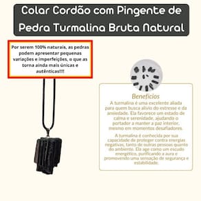 Colar Cordão com Pingente de Pedra Turmalina Bruta Natural Colar Cordão com Pingente de Pedra Turmalina Bruta Natural Este colar com cordão e pingente de pedra turmalina bruta natural é uma peça única e cheia de poder. A turmalina é conhecida por suas propriedades protetoras e curativas, sendo ideal para quem busca proteção energética, equilíbrio emocional e fortalecimento da aura. O formato bruto da pedra traz um charme rústico e autêntico, tornando cada peça ainda mais especial e cheia de personalidade. Benefícios Energéticos da Turmalina: Proteção Energética e Purificação: A turmalina é uma das pedras mais poderosas para proteção, sendo eficaz para bloquear e transmutar energias negativas. Ela ajuda a criar um escudo energético ao redor do portador, proporcionando proteção em ambientes e situações desafiadoras. Equilíbrio e Harmonia Emocional: Esta pedra é excelente para equilibrar as emoções e trazer clareza mental. Ela ajuda a aliviar , ansiedade e outros bloqueios emocionais, promovendo uma sensação de tranquilidade, equilíbrio e paz interior. Enviamos em até 24 horas após a confirmação do pagamento