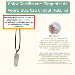 Colar Cordão com Pingente Pedra Quartzo Cristal Colar Cordão com Pingente de Pedra Quartzo Cristal Natural Este colar com cordão e pingente de pedra quartzo cristal natural é uma peça sofisticada e energética, perfeita para quem busca equilíbrio e clareza. O quartzo cristal é uma das pedras mais poderosas e versáteis, sendo conhecido por sua capacidade de amplificar energias, promover a limpeza energética e trazer equilíbrio mental e emocional. Ao ser como pingente, ele não só adiciona um toque elegante ao seu visual, mas também age como um amuleto que favorece a purificação, a clareza mental e o fortalecimento da energia pessoal. Benefícios Energéticos: Amplificação de Energia: O quartzo cristal é conhecido por sua habilidade de amplificar as energias ao redor, seja para potencializar os efeitos de outras pedras ou para fortalecer a energia do portador. Ele pode aumentar a vibração energética e auxiliar em processos de cura e equilíbrio. Purificação e Limpeza Energética: Esta pedra é uma das mais poderosas para purificação de energias. Ela limpa ambientes e a aura do portador, removendo bloqueios e influências negativas, criando um campo energético mais harmonioso e saudável. Clareza Mental e Equilíbrio Emocional: O quartzo cristal é altamente eficaz em trazer clareza mental, promovendo decisões mais racionais e equilibradas. Ele também ajuda a equilibrar as emoções, proporcionando uma sensação de paz interior, tranquilidade e calma. Por serem 100% naturais, as pedras podem apresentar pequenas variações e imperfeições, o que as torna ainda mais únicas e autênticas. Enviamos em até 24 horas após a confirmação do pagamento Se você tiver alguma dúvida, não hesite em nos mandar uma mensagem Responderemos rapidamente para ajudá-lo da melhor forma possível Marca: Não Informado