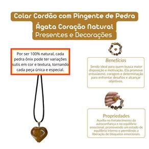 Colar Cordão Pingente de Pedra Ágata Coração Natural colar Cordão com Pingente de Pedra Ágata Coração Natural Este colar sofisticado com cordão e pingente de pedra ágata em formato de coração é uma verdadeira peça de elegância e harmonia. A ágata é uma pedra conhecida por suas propriedades de equilíbrio e estabilidade, sendo ideal para quem busca paz interior e fortalecimento emocional. Ao ser Utilizado como pingente, ela além de embelezar o visual, traz consigo uma energia e protetora, promovendo serenidade e clareza mental. Benefícios Energéticos: Equilíbrio e Estabilidade: A ágata é famosa por suas qualidades de harmonização, equilibrando as energias do corpo e da mente. Ela ajuda a promover estabilidade emocional, proporcionando maior tranquilidade e segurança em momentos de tensão. Proteção e Serenidade: A pedra ágata também é conhecida por seu poder protetor, afastando energias negativas e promovendo uma sensação de paz. Ela é ideal para quem busca se proteger de influências externas e encontrar equilíbrio interno. Clareza Mental e Crescimento Pessoal: Além de equilibrar as emoções, a ágata estimula a clareza mental, ajudando no processo de tomada de decisões e no crescimento pessoal. Ela favorece a introspecção, a paciência e o autoconhecimento. Por serem 100% naturais, as pedras podem apresentar pequenas variações e imperfeições, o que as torna ainda mais únicas e autênticas. Enviamos em até 24 horas após a confirmação do pagamento Se você tiver alguma dúvida, não hesite em nos mandar uma mensagem Responderemos rapidamente para ajudá-lo da melhor forma possível Marca: Não Informado