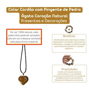Colar Cordão Pingente de Pedra Ágata Coração Natural colar Cordão com Pingente de Pedra Ágata Coração Natural Este colar sofisticado com cordão e pingente de pedra ágata em formato de coração é uma verdadeira peça de elegância e harmonia. A ágata é uma pedra conhecida por suas propriedades de equilíbrio e estabilidade, sendo ideal para quem busca paz interior e fortalecimento emocional. Ao ser Utilizado como pingente, ela além de embelezar o visual, traz consigo uma energia e protetora, promovendo serenidade e clareza mental. Benefícios Energéticos: Equilíbrio e Estabilidade: A ágata é famosa por suas qualidades de harmonização, equilibrando as energias do corpo e da mente. Ela ajuda a promover estabilidade emocional, proporcionando maior tranquilidade e segurança em momentos de tensão. Proteção e Serenidade: A pedra ágata também é conhecida por seu poder protetor, afastando energias negativas e promovendo uma sensação de paz. Ela é ideal para quem busca se proteger de influências externas e encontrar equilíbrio interno. Clareza Mental e Crescimento Pessoal: Além de equilibrar as emoções, a ágata estimula a clareza mental, ajudando no processo de tomada de decisões e no crescimento pessoal. Ela favorece a introspecção, a paciência e o autoconhecimento. Por serem 100% naturais, as pedras podem apresentar pequenas variações e imperfeições, o que as torna ainda mais únicas e autênticas. Enviamos em até 24 horas após a confirmação do pagamento Se você tiver alguma dúvida, não hesite em nos mandar uma mensagem Responderemos rapidamente para ajudá-lo da melhor forma possível Marca: Não Informado Ean: 7894135848599