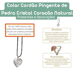 Colar Cordão Pingente de Pedra Cristal Coração Natural Colar Cordão com Pingente de Pedra Quartzo Cristal Natural Este colar com cordão e pingente de pedra quartzo cristal natural é uma peça sofisticada e energética, perfeita para quem busca equilíbrio e clareza. O quartzo cristal é uma das pedras mais poderosas e versáteis, sendo conhecido por sua capacidade de amplificar energias, promover a limpeza energética e trazer equilíbrio mental e emocional. Ao ser como pingente, ele não só adiciona um toque elegante ao seu visual, mas também age como um amuleto que favorece a purificação, a clareza mental e o fortalecimento da energia pessoal. Benefícios Energéticos: Amplificação de Energia: O quartzo cristal é conhecido por sua habilidade de amplificar as energias ao redor, seja para potencializar os efeitos de outras pedras ou para fortalecer a energia do portador. Ele pode aumentar a vibração energética e auxiliar em processos de cura e equilíbrio. Purificação e Limpeza Energética: Esta pedra é uma das mais poderosas para purificação de energias. Ela limpa ambientes e a aura do portador, removendo bloqueios e influências negativas, criando um campo energético mais harmonioso e saudável. Clareza Mental e Equilíbrio Emocional: O quartzo cristal é altamente eficaz em trazer clareza mental, promovendo decisões mais racionais e equilibradas. Ele também ajuda a equilibrar as emoções, proporcionando uma sensação de paz interior, tranquilidade e calma. Por serem 100% naturais, as pedras podem apresentar pequenas variações e imperfeições, o que as torna ainda mais únicas e autênticas. Enviamos em até 24 horas após a confirmação do pagamento Se você tiver alguma dúvida, não hesite em nos mandar uma mensagem Responderemos rapidamente para ajudá-lo da melhor forma possível Marca: Não Informado Ean: 7894135848575