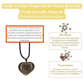 Colar Cordão Pingente de Pedra Quartzo Fumê Coração Natural Colar Cordão com Pingente de Pedra Quartzo Fumê Coração Natural Este colar com cordão e pingente de pedra quartzo fumê coração natural é uma peça elegante e cheia de significado. O quartzo fumê, com sua tonalidade única de cinza a marrom, é uma pedra poderosa de proteção e equilíbrio. O formato de coração traz uma estética delicada e romântica, ideal para quem deseja aliar beleza e energia positiva no seu visual. Benefícios Energéticos do Quartzo Fumê: Proteção e Purificação Energética: O quartzo fumê é amplamente conhecido por suas propriedades de proteção. Ele ajuda a transmutar energias negativas em positivas, criando um campo protetor ao redor de quem o usa. Ideal para manter o equilíbrio energético durante o dia a dia. Equilíbrio Emocional e Relaxamento: Esta pedra tem um efeito sobre as emoções e pode ajudar a aliviar o e a ansiedade. O quartzo fumê promove uma sensação de serenidade e ajuda a limpar a mente, favorecendo o relaxamento profundo. Fortalecimento da Autoestima e Confiança: O quartzo fumê também é uma excelente pedra para fortalecer a autoestima e promover a autoconfiança. Ele proporciona uma sensação de segurança e estabilidade emocional, sendo perfeito para quem busca mais equilíbrio interior. Por serem 100% naturais, as pedras podem apresentar pequenas variações e imperfeições, o que as torna ainda mais únicas e autênticas Enviamos em até 24 horas após a confirmação do pagamento Se você tiver alguma dúvida, não hesite em nos mandar uma mensagem Responderemos rapidamente para ajudá-lo da melhor forma possível Marca: Meta Atacado