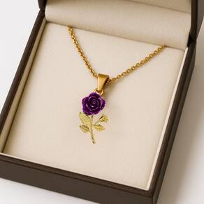 Este colar especial une a delicadeza da rosa roxa ao poder espiritual de Maria Mulambo, entidade reverenciada na Umbanda por sua força, proteção e sabedoria. O pingente de aproximadamente 3 cm é confeccionado em metal dourado, transmitindo brilho e sofisticação, enquanto a cor roxa simboliza mistério, espiritualidade e transformação.