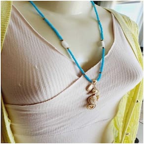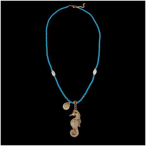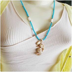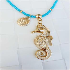 Colar de cristais de vidro azul com pingentes dourados em formato de cavalo marinho.