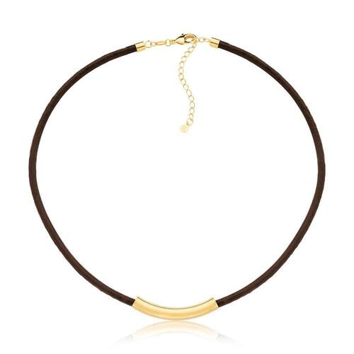 Este colar foi elaborado em Couro Natural, na cor marrom café, com um lindo acessório canutilho curto que acompanha a forma circular da peça. Com metais revestidos em ouro, seu design sofisticado une conforto e beleza, tornando uma peça atemporal e única, de alta durabilidade.