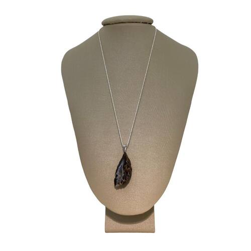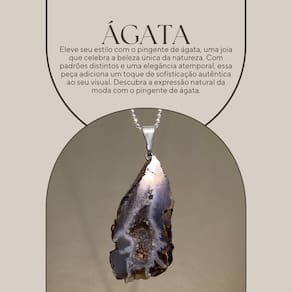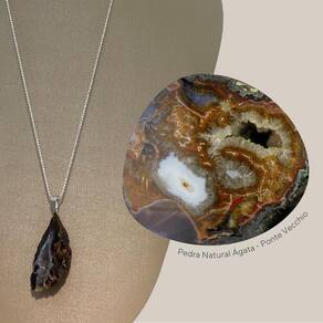O pingente de Geodo de Ágata revela uma beleza natural crua, com sua superfície polida que encerra camadas de cores terrosas e cavidades cristalinas resplandecentes.
