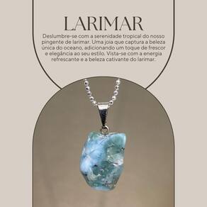 O pingente Larimar exibe um azul celeste com padrões brancos, capturando a serenidade do céu e do mar em uma única gema.