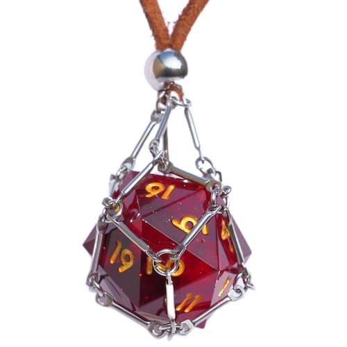 Especificações: Tipo de metal: aço inoxidável. Tipo de corrente: couro de camurça Tipo de pedra: dados de resina D20 Peso: 12 ~ 15 g Comprimento da corda: 80 ~ 85 cm Tamanho dos dados: 26 ~ 28 mm - ·Este colar de dados D20 removível - · Basta desbloquear a gaiola de aço sólido, fazer sua troca, e você está pronto para rolar! - ·Basta retirar seus dados D20 da gaiola e rolar. - Nosso colar de gaiola de dados é o presente perfeito para qualquer fã de jogos de RPG. Ele armazenará seus dados D20 favoritos, aquele que traz toda a sorte. - · Peso: 12 ~ 15 g Comprimento do colar: 85 cm