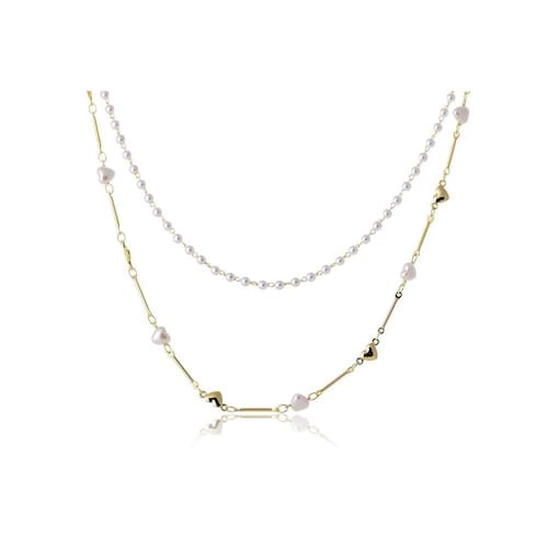 Colar Duplo com Corrente de Pérola e Mini Corações Dourados Folheado em Ouro 18k O Colar Duplo com Pérolas e Corações Dourados é incrível! Moderno e atemporal, esse acessório promete deixar seus momentos mais completos. Use e abuse da sua criatividade fazendo combinações e montando um mix que tem a sua cara. Folhado em ouro 18k.