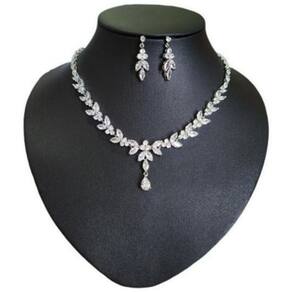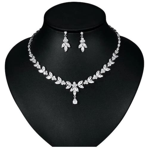 Colar e brinco banhados a ródio com pedras de zircônia.