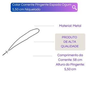 Colar Corrente Pingente Espada Ogum 5,50 Cm Niquelado Descrição do Produto: O Colar Corrente Pingente Espada Ogum 5,50 Cm Niquelado é ideal para quem busca proteção e aberturas de caminhos. Feito em liga de zinco em camadas, esse colar possui um pingente de espada de 5,5 centímetros de tamanho e uma corrente de 30 centímetros. O fecho de mosquetão garante segurança e praticidade ao usar o colar. Cuidados com sua bijuteria: Para garantir a durabilidade do seu colar, evite o contato com produtos químicos e de limpeza, como cremes, shampoo, detergentes e perfumes. É recomendado retirar a peça ao manusear esses produtos, pois eles podem danificar o material do colar ao longo do tempo. Tome cuidado também ao aplicar perfume diretamente na peça, pois o álcool presente na composição pode causar danos. Embalagem de Envio: O colar será enviado em embalagem de papelão e plástico bolha, garantindo que o produto chegue em perfeitas condições. Temos experiência em realizar entregas em todo o Brasil, e assim que seu pedido for despachado, você receberá um código de rastreamento para acompanhar a entrega. Perguntas Frequentes: R1: Já realizamos milhares de entregas em todo o Brasil, somos especialistas no que fazemos. R2: Assim que seu pedido for despachado, você receberá um código de rastreamento para acompanhar a entrega. R3: Enviamos o produto 100% inspecionado e conferido em nosso checkout, garantindo sua qualidade. R4: O tempo de entrega varia de acordo com o seu CEP. Todos os nossos produtos são despachados de Capital. R5: Iremos despachar o seu produto o mais rápido possível, em até 24h após a confirmação do pedido. R6: Estamos comprometidos com a sua satisfação. Se houver algum problema, conosco através dos nossos canais de comunicação. Marca: Não Informado Ean: 7890003926468