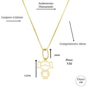 Seja bem-vindo(a) ao grupo DR Joias _x005F_x005F_x005F_x005F_x005F_x005F_x005F_x000D_ _x005F_x005F_x005F_x005F_x005F_x005F_x005F_x000D_ A DR joias traz a segurança que você precisa para comprar a sua joia online. Somos especializados em joias de Ouro 18k e de Prata 925, com experiência de quase 10 anos em vendas pela internet. _x005F_x005F_x005F_x005F_x005F_x005F_x005F_x000D_ _x005F_x005F_x005F_x005F_x005F_x005F_x005F_x000D_ Temos uma grande variedade de produtos para agradar a todos os estilos, proporcionando o que há de melhor em joias. Procuramos ir além de atender as suas necessidades, queremos superar as suas expectativas!!!_x005F_x005F_x005F_x005F_x005F_x005F_x005F_x000D_ _x005F_x005F_x005F_x005F_x005F_x005F_x005F_x000D_ Todos os nossos produtos, possuem certificado de garantia de autenticidade do material, que podem ser testados e comprovados em qualquer joalheria do Brasil._x005F_x005F_x005F_x005F_x005F_x005F_x005F_x000D_ Descrição da Corrente Feminina em Ouro 18k:_x005F_x005F_x005F_x005F_x005F_x005F_x005F_x000D_ Tamanho da corrente: 50cm_x005F_x005F_x005F_x005F_x005F_x005F_x005F_x000D_ Largura da corrente: 0,55 mm_x005F_x005F_x005F_x005F_x005F_x005F_x005F_x000D_ Peso total: 1.20 gramas_x005F_x005F_x005F_x005F_x005F_x005F_x005F_x000D_ Material: Ouro 18k_x005F_x005F_x005F_x005F_x005F_x005F_x005F_x000D_ Forma: MaciçaTamanho do Pingente: 1.5cm (Com o Passador)_x005F_x005F_x005F_x005F_x005F_x005F_x005F_x000D_ Acompanha embalagem para guardar a sua joia.O destaque desta deslumbrante peça de joalheria é o encantador pingente em forma de menina. A menina é meticulosamente esculpida, capturando sua graça e inocência de forma inigualável._x005F_x005F_x005F_x005F_x005F_x005F_x005F_x000D_ Ouro 18k é um metal precioso altamente valorizado por sua durabilidade, beleza e brilho. Joias feitas com ouro 18k apresentam 75% de ouro puro combinado com outros metais, produzidas em uma liga forte e resistente perfeita para uso diário.