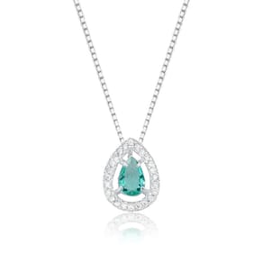 Material: Prata 925 de alta qualidade, oferecendo durabilidade e um acabamento impecável. Pedras: Brilhantes cuidadosamente cravejados ao redor de uma pedra central verde água, criando um contraste encantador Design: Pingente em formato de gota que realça a beleza da pedra central e adiciona um toque de elegância Acabamento: Superfície polida para um brilho intenso e duradouro Comprimento da Corrente: 45 cm
