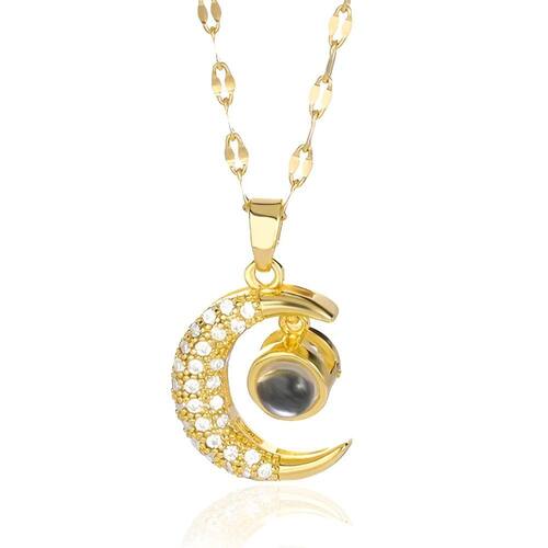Especificações: Material: Bronze Formato: Lua Projeção: Eu te amo em 100 idiomas Pedra: Zircônia Cor: Dourado Banho: Ouro 18k Fecho: Trava Lagosta Propriedades: Hipoalérgico