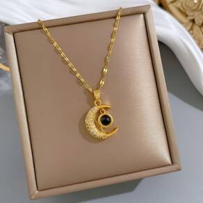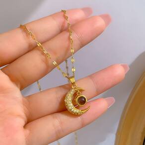 Colar em formato de lua com uma lente ao centro que quando colocada em frente a luz projeta a frase "Eu te amo" em 100 idiomas diferentes. Perfeito para presentear a pessoa amada.