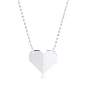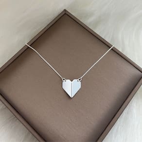 Este colar encantador é uma combinação perfeita de simplicidade e criatividade, com um pingente em forma de coração que imita a arte das dobraduras. É uma peça sofisticada e moderna, perfeita para destacar qualquer look.