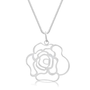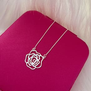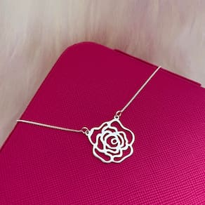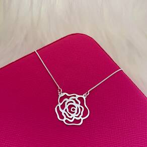 Lindo colar apresentando um pingente de rosa estilizada, que combina simplicidade e elegância. O design da rosa é vazado, permitindo que capture a luz de forma sutil. O pingente está suspenso por uma corrente fina e delicada, que complementa a leveza do design. Ideal para quem aprecia jóias minimalistas com um toque de sofisticação.