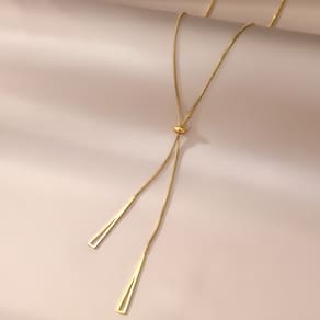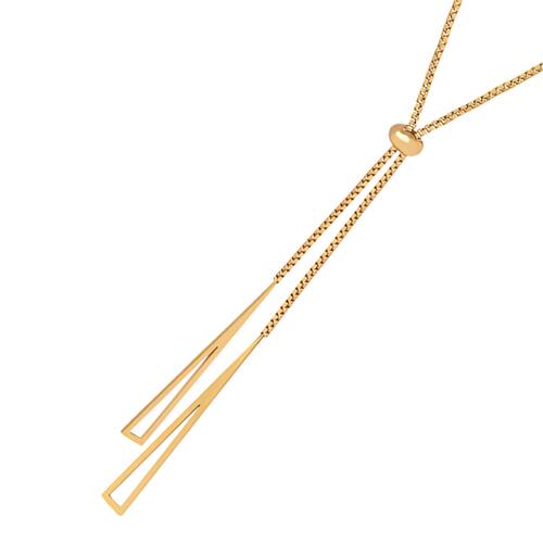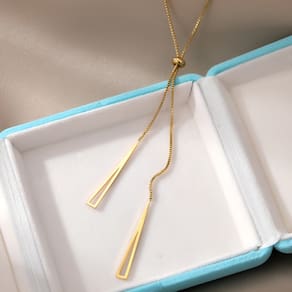 O colar feminino com dois pingentes geométricos em forma de triângulos estreitos é uma peça de joalheria moderna e elegante. Os triângulos, com suas linhas limpas e ângulos precisos, evocam uma sensação de equilíbrio e dinamismo, tornando este colar uma escolha perfeita para adicionar um toque de sofisticação geométrica a qualquer visual.