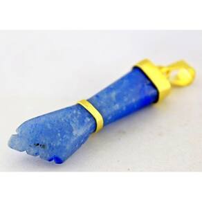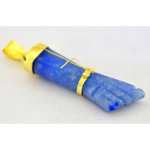 Pingente Amuleto Figa Pedra Quartzo Azul, lapidação totalmente artesanal com polimento vibrado, a montagem é feita em volto da peça dourada.