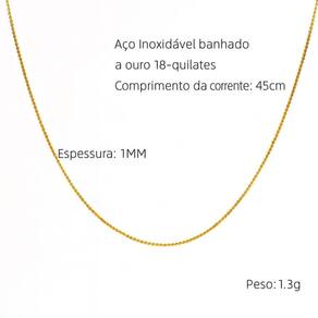 Este colar delicado é confeccionado em aço inoxidável banhado a ouro 18K, garantindo brilho e durabilidade. Seu design minimalista e elegante é perfeito para o uso diário ou para compor looks sofisticados. A corrente fina com espessura de 1mm confere leveza e discrição, ideal para ser usada sozinha ou com pingentes sutis.