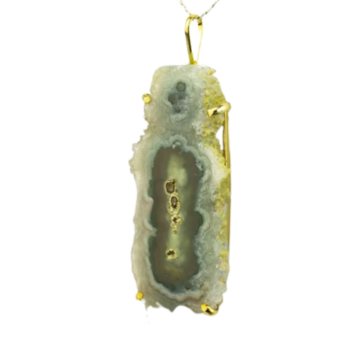 Pingente Flor de Ametista Pedra Natural Garra Dourada, Pingente Chapa de Estalactite com acabamento Liso montagem na garra dourado com perinha para passar o cordão Pedra Genuina com origem garimpo lapidação e montagem manual.