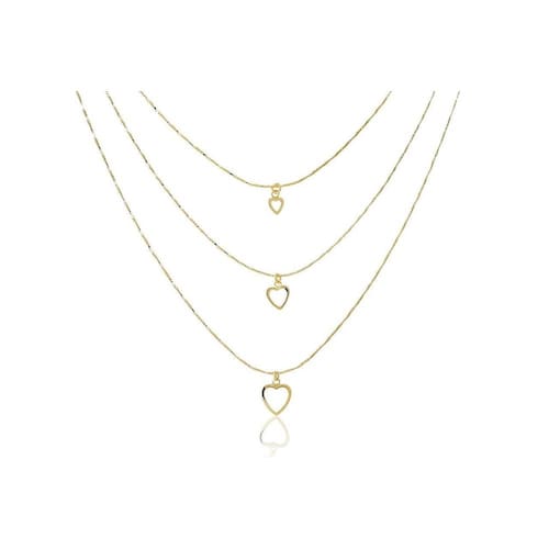 Colar folheado em ouro 18k com corações vazados O apaixonante colar com corações vazados é a escolha perfeita para deixar suas ocasiões ainda mais especiais e intensas. É um item charmoso onde sua composição folheada em ouro 18k permite que você combine outros acessórios sem perder a elegância e marcando presença onde quer que esteja. Esse colar vai deixar você lindíssima e encantadora. Use e abuse medida do colar/corrente1°: 48cm;medida do colar/corrente2°: 38cm;medida do colar/corrente3°:41cm. Esse acessório é antialérgicogarantia: 6 meses. Ficha técnica - Cor: Dourado