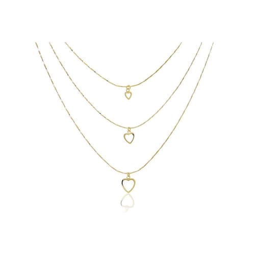 Colar folheado em ouro 18k com corações vazados O apaixonante colar com corações vazados é a escolha perfeita para deixar suas ocasiões ainda mais especiais e intensas. É um item charmoso onde sua composição folheada em ouro 18k permite que você combine outros acessórios sem perder a elegância e marcando presença onde quer que esteja. Esse colar vai deixar você lindíssima e encantadora. Use e abuse medida do colar/corrente1°: 48cm;medida do colar/corrente2°: 38cm;medida do colar/corrente3°:41cm. Esse acessório é antialérgicogarantia: 6 meses. Ficha técnica - Cor: Dourado Ean: 7898707882066