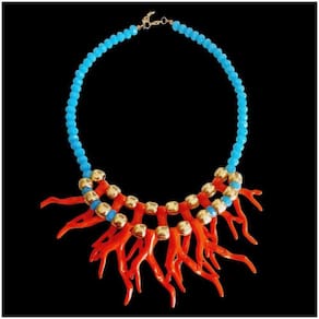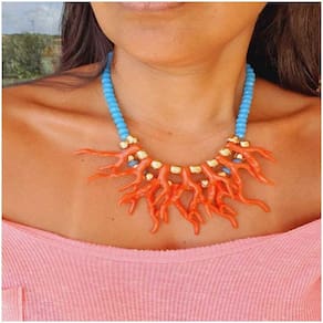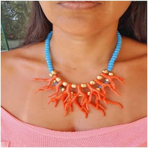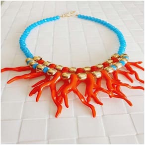 Colar em cristais de vidro azul e galhos de coral em resina.