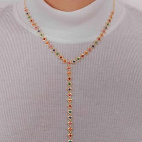 Colar gravatinha olho grego colorido Esse colar é em formato de gravatinha com olho grego colorido, um verdadeiro encanto. O charme desse colar está justamente no olho grego, que simboliza a proteção contra as forças ruins e o mau olhado. Um acessório que irá te conquistar desde o primeiro dia, pois é perfeito para montar combinações únicas. Uma peça cheia de significados assim não pode faltar na sua coleção, sem dúvidas um acessório que você irá amar pela praticidade ao montar composições. Uma curiosidade sobre o olho grego é que ele também pode ser chamado de olho turco ou nazar e é um poderoso amuleto para afastar inveja e o mau olhado. Compre agora e continue arrasando no visual e afastando toda a energia negativa