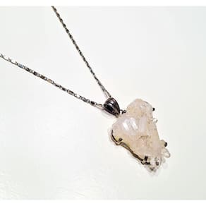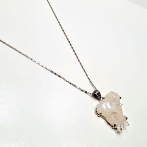 Colar feito com cristal de Quartzo e detalhes em metal com banho prateado. Peça trabalhada à mão. Pingente com aproximadamente 5cm. Confortável e leve, a corrente possui 50cm de circunferência. Acabamento de qualidade. Peso: 15g Design exclusivo.