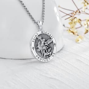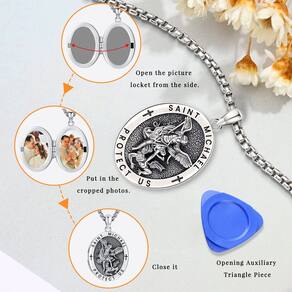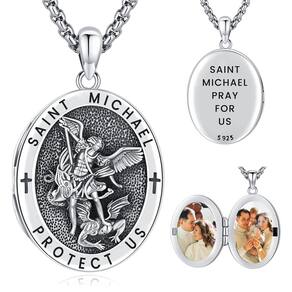LOOVE Colar Saint S925 Prata Esterlina Patrono St Amulet Medalha Pingente de Proteção Joias para Homens e Mulheres, Prata esterlina, Sem Pedra Preciosa - Inscrição: "SÃO MICHAEL PROTEJA-NOS", "SAINT MICHAEL PRAY FOR US - Colar com medalhão: este colar de medalhão de São Miguel pode armazenar duas fotos significativas para você. Mantenha seu ente querido ou um momento feliz na forma de uma foto para comemorar o amor eterno e memórias - Significado: São Miguel é o protetor daqueles que o invocam, o campeão da justiça, protegendo-nos contra perigos. Use este colar com medalhão de São Miguel, deixe o arcanjo proteger você e a pessoa na foto - Material e tamanho: o tamanho do pingente Arcanjos de prata esterlina é de 20,00 x 35,50 mm (0,79 x 1,40 pol), o comprimento da corrente da caixa de aço inoxidável de 2 mm é de 61 cm (22 + 5.1 cm) - Presente: o colar com medalhão Arcanjo vem em uma caixa de presente e é completo com um pano de limpeza de joias e uma peça triangular auxiliar de abertura. É um presente significativo para você, amigos e familiares - Atendimento ao cliente: Se você tiver alguma dúvida, faremos o nosso melhor para resolvê-la para você