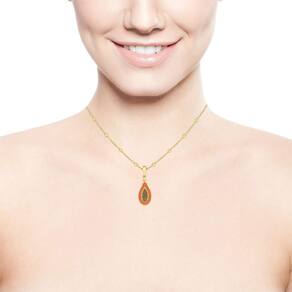 Nosso Colar Mamão traz a fruta esmaltada e detalhes realistas. Sua corrente veneziana possui pequenas esferas que acrescentam charme e beleza. Com revestimento em Ouro, possui 3 regulagens de tamanho.