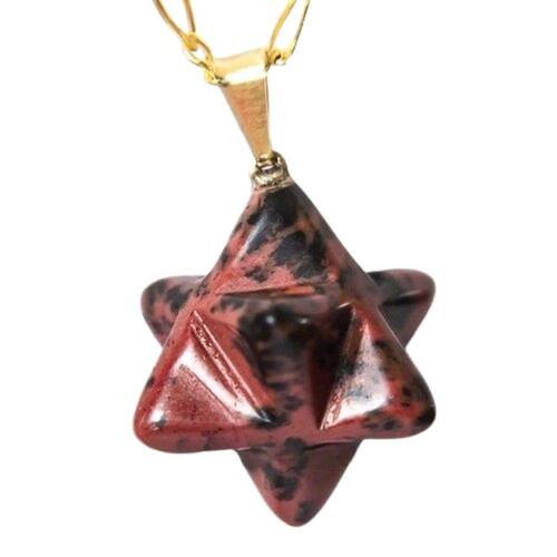 Pingente Merkabah Obsidiana Mahogany, pedra natural de garimpo com exelente lapidação em formato estrela merkabah. Montagem em pino dourado.