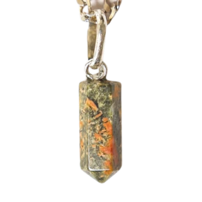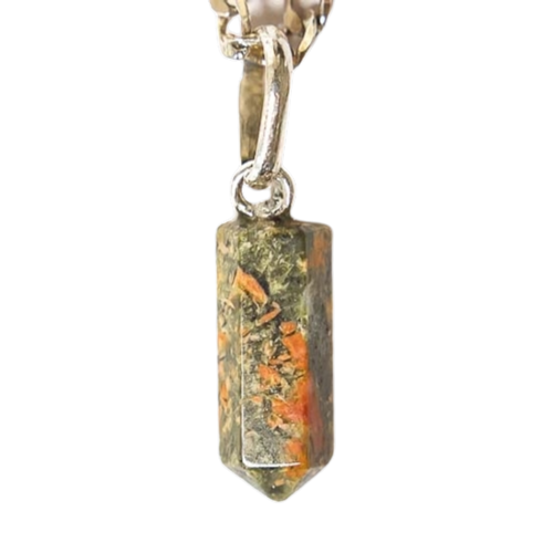 Colar pontinha de unakita e pino prata 950. Uma peça versátil, sofisticada e cheia de personalidade para agregar ao seu guarda-roupa.