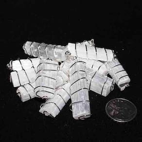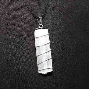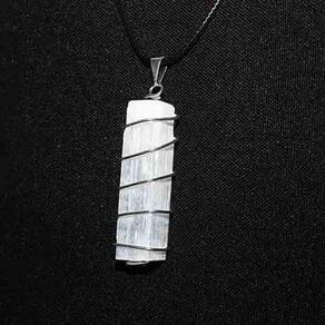 Colar com Pingente Canudo de Selenita Grande. Pingente Pedra natural mineral verdadeiro de garimpo excelente preço, montagem em espiral banhado em prata, recomendado para pulseiras ou crianças.