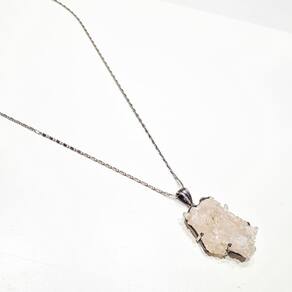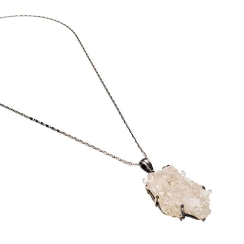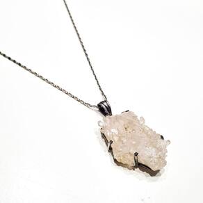 Colar feito com cristal de Quartzo e detalhes em metal com banho prateado. Peça trabalhada à mão. Pingente com aproximadamente 5cm. Confortável e leve, a corrente possui de 50cm de circunferência. Acabamento de qualidade. Peso: 15g Design exclusivo.