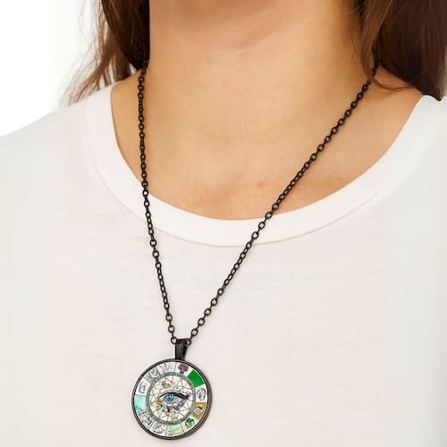 Colar Olho Místico com Pingente Redondo é um acessório cheio de simbolismo e estilo. O pingente circular traz o desenho de um olho centralizado envolto por padrões geométricos e elementos esotéricos coloridos, que remetem à proteção e espiritualidade. A corrente em tom preto contrasta perfeitamente com os detalhes vibrantes do pingente, criando um visual moderno e único. Ideal para quem gosta de acessórios místicos, alternativos ou deseja dar um toque de personalidade ao look.