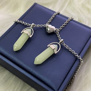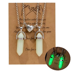 Quando usar o colar em ambiente escuro, os pingentes brilham com uma cor verde vibrante, criando um efeito místico e chamativo. Este colar pode simbolizar conexão ou cumplicidade, ideal para casais ou amigos, com um estilo moderno e elegante, com um toque especial de brilho noturno.