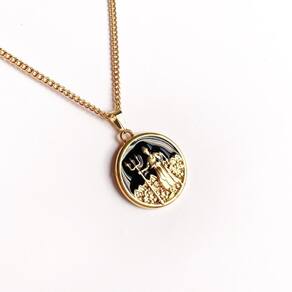 Colar com pingente Medalha Exu, com detalhes em resina preta, esse orixá ganha o significado de sentinela e protetor, conhecido também como uma espécie de mensageiro entre os orixás e o ser humano. Diâmetro total: 26mm Corrente: 60 cm Material: zamac dourado com camadas de verniz italiano de 3 meses no banho e cravação das pedras mediante a defeitos de fabricação e não mau uso pelo cliente Caso aconteça um desgaste do banho, mudança de coloração, a peça será submetida a teste para averiguar se foi problema de fabricação ou mau uso. Marca: Não Informado