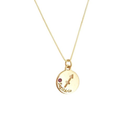 Colar zodiac signo sagitário - de 22 de novembro a 21 de dezembro; Colar com pingente com medalha de signo de sagitátio, que vem com uma pedrinha com a cor Do signo descrito de strass, banhado a ouro amarelo 18k metal nobre . De um lado da medalha vem gravado por escrito o signo e a pedrinha colada com uma cola Específica para joias e do outro é gravado por escrito a característica mais forte da Personalidade desse signo. Cor do strass: roxo Curiosidade: o roxo equilibra a mente e ajuda transformar a obsessões e medos, associada a Proteção psíquica, produz um efeito libertador e transmutação. Palavras chaves da cor: sabedoria, criatividade, independência, dignidade, serenidade, Mudança e transgressão. Característica do signo: otimismo Corrente tipo veneziana com 1,00 mm de espessura x 45 cm de comprimento. Tamanho do pingente: 16,00mm de diâmetro x 2,40 de espessura. Acabamento: liso Banho de 6 milesimos co camad0a de verniz Peças feitas em latão metal baixo e banhadas ouro amarelo 18k metal nobre Garantia de 3 meses no banho e cravação das pedras mediante a defeitos de fabricação e não Mau uso pelo cliente Caso aconteça um desgaste do banho, mudança de coloração, a peça será submetida a teste Para averiguar se foi problema de fabricação ou mau uso. Nosso banho é denominado hipoalergênico pois não contém niquel na composição Marca: Le Rouge Joias Ean: 7795992987288