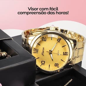 Características Principais: - Pedra de Strass Cravejada: O destaque deste relógio está na sua incrível pedra de strass que adorna o pino de regulagem, adicionando um toque de brilho e glamour. - Arte Artesanal na Parte Traseira: Cada unidade é única, apresentando uma arte exclusiva feita artesanalmente na parte traseira do relógio. Essa característica especial confere um charme singular à peça. - Conjunto Completo - Pulseira e Colar: O conjunto inclui não apenas o relógio, mas também uma pulseira e um colar, ambos banhados a ouro. Essas peças harmonizam perfeitamente, proporcionando um visual completo e refinado. - Caixa Premium Multiuso: O conjunto é acompanhado por uma linda caixa premium. Esta caixa não apenas protege as peças, mas também pode ser utilizada como um elegante porta jóias. Um toque luxuoso para armazenar suas preciosidades.