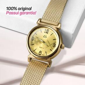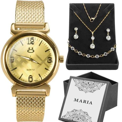- Relógio Digital Feminino Orizom Maria, com maquinário dourado banhado a ouro e pulseira ajustável em silicone. - Pulseira Dourada Banhada em Aço Inoxidável, com pedrinhas de strass transparentes para um toque de brilho sutil. - Colar Dourado Banhado em Aço Inoxidável, com pingente de strass transparente para glamour e sofisticação. - Par de Brincos Banhados, com pedrinhas de strass para adicionar elegância ao visual. - Caixa Premium Orizom Maria, para uma apresentação elegante do presente.