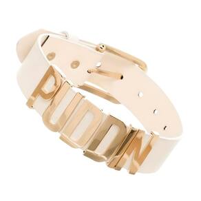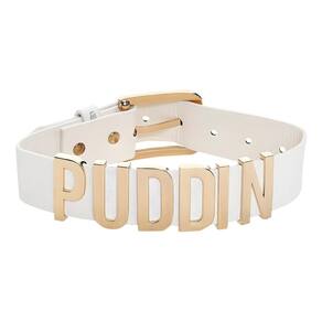 - O acessório de fantasia de alta qualidade apresenta uma gargantilha de couro sintético off-white com a palavra "PUDDIN" em letras de metal dourado na frente e uma fivela de segurança dourada na parte de trás