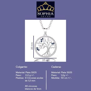 Collar de Plata “Árbol de la Vida”, incluindo colgante e cadeia, possui círculos azuis de corte brilhante, design elegante e clássico.. Material: Prata 925. Código: COL_CAD_108 Pedras: Circón Calidad AAA. Peso total: 3,2 g +/- Medida da cadeia: 50 cm. Tamanho do braço: 2 x 2 cm +/- Inclui: Kit de presente. Todas nuestras joyas son libres de níquel y tienen un tratamiento especial chamado Rodinado, es el mismo tratamiento que se aplica a las joyas de Oro Blanco, para que se mantengan más brillantes (la duración de este tratamiento dependerá del cuidado que se le dé a la joya), además este tratamiento tiene propiedades antipiedades alérgicas. Recomendações de uso: -Não exponha a alegria a elementos corrosivos, como produtos químicos, detergentes, perfumes, ácidos, etc... -Não limpe com panos que não sejam os indicados. -Guarde a alegria da forma apropriada, idealmente na caixa que será entregue de presente.