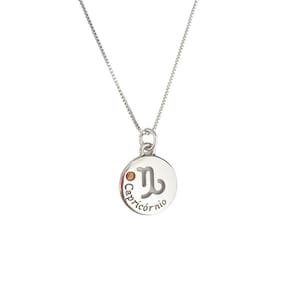 Este lindo colar possui um pingente com medalha do signo de Capricórnio, que vem com uma pedrinha de strass marrom, representando a cor do signo. O pingente é banhado a rodio branco ou platina, um metal nobre que garante durabilidade e brilho intenso.
