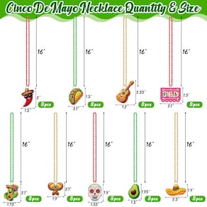 O pacote inclui 72 colares de contas cinco de mayo em 9 designs. O design apresenta papel fiesta picado, taco, abacate, máscara, cacto, chapéu, frio, maraca, guitarra.
