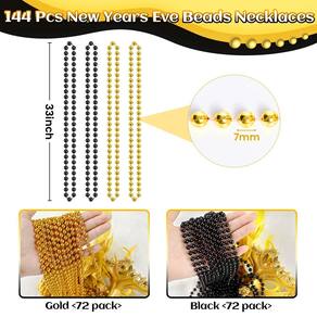 144 peças de colares de véspera de Ano Novo, colares dourados e pretos de Ano Novo, acessórios redondos de Feliz Ano Novo de 33 polegadas e 7 mm, miçangas de festa de Ano Novo de 2025 para o Dia de Ano Novo, Natal e lembrancinhas de carnaval