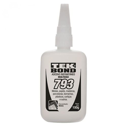 Colas Adesiva Instantânea Tek Bond 793 100g Aplicação: Adere diversos tipos de materiais, como compostos de borracha, EPDM, borracha nitrílica, neoprene, EVA e Viton. É um adesivo multiuso, muito utilizado no setor moveleiro, setor industrial principalmente em artesanato de chinelos, caixas de MDF e muito mais. Características: É um produto monocomponente e não requer mistura. O processo de cura inicia-se quando uma fina camada de adesivo é aplicada entre as superfícies entrando em contato com a umidade do ar atmosférico. Modo de Uso: Para obter um resultado satisfatório, as superfícies devem estar limpas, isentas de óleo e sujeira. Deve-se aplicar uma camada fina de adesivo em apenas 1(um) dos substratos a serem colados, pois o excesso prejudica o bom desempenho da colagem. Após a aplicação do adesivo, é preciso manter as peças pressionadas por aproximadamente 20 segundos, quando a cura inicial estará concluída e a peça poderá ser manuseada com segurança. A cura total ocorrerá em 24 horas. Este adesivo é indicado para folgas de até 0,10mm. Precauções: O excesso de cola prejudica a colagem. Cola a pele e olhos em poucos segundos. Mantenha fora do alcance das crianças. Dados Técnicos: Viscosidade (cP): 80 a 120 (Média) Temperatura de Trabalho (ºC): -55 a 80 Preenchimento de Folgas (mm): Até 0,10 Resistência ao Cisalhamento (Aço x Aço): ? 100Kgf/cm2